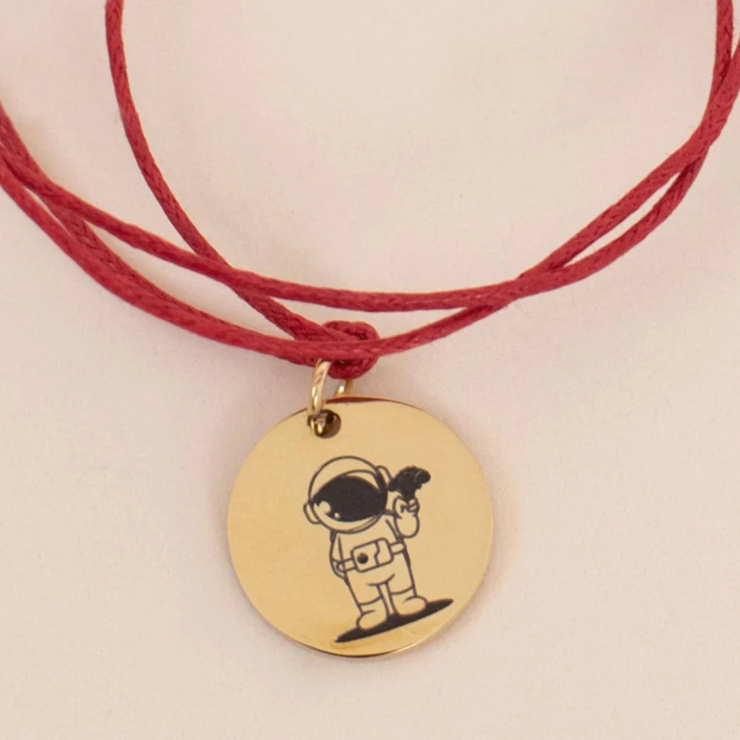 Dieses Armband hat sich die Designerin Sabine Hinrichs ausgedacht. Es soll dir helfen, nach dem Body Reset Kurs weiter an der guten Ernährung dran zu bleiben. Auf dem vergoldeten Plättchen ist eine Astronautin, die einen Brokkoli in der Hand hält. Das rote Baumwollband wickelst du dir um den Arm und verknotest es. Es wird dich lange begleiten.
