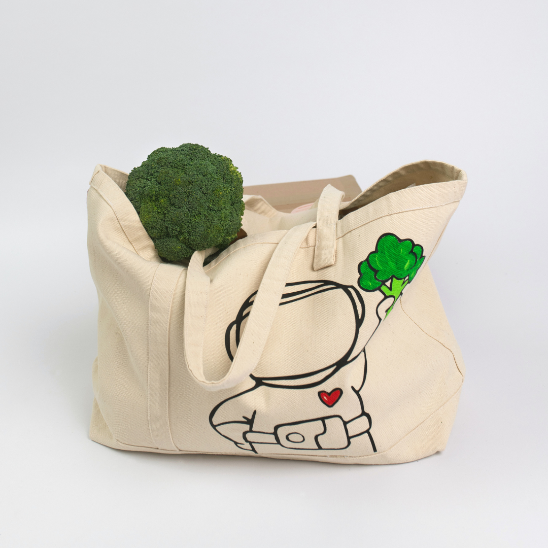 Diese Tragetasche (oder auch "Tote Bag" abgeleitet von "mit der Hand tragen") haben wir in kleiner Auflage bei Made auf Veddel produzieren lassen. Die Vorlage dazu ist die Lieblingstasche meines Mannes, die er sich vor Jahren aus den USA mitgebracht hatte. Der Stoff ist aus dicker Baumwolle(100%), die Tragebänder haben wir extra lang gemacht, damit du sie auch mit dicker Jacke einfach über den Arm hängen kannst. Die Tasche ziert unsere Astronautin mit Brokkoli und an der Seite haben wir ein kleines NOBODYTOLDME Logo einnähen lassen. Die Tasche kommt in der Geschenkverpackung zu dir nach Hause.